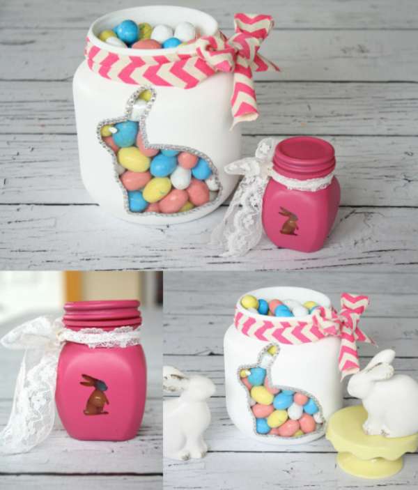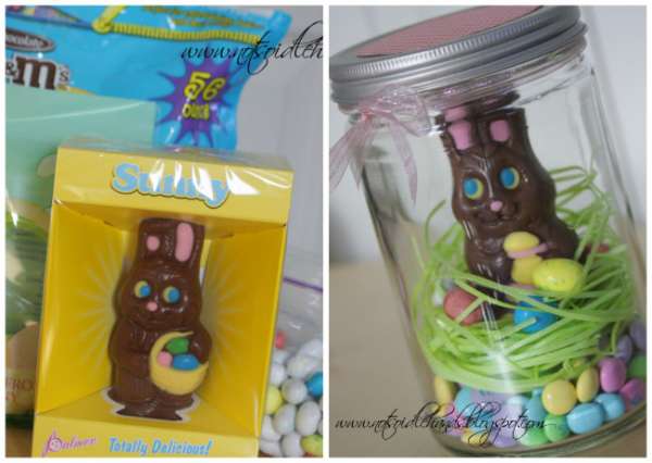 Vous ne pouvez pas faire plus simple ! Une fois après avoir décoré l’intérieur avec des petites friandises, placez un beau lapin en chocolat au milieu de ce décor et refermez le bocal.