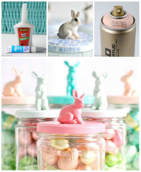 De la même manière que cette idée, customisez les couvercles de vos contenants grâce à des petits lapins en plastique et de la peinture en bombe ! Tous les détails sont disponibles sur cette page.