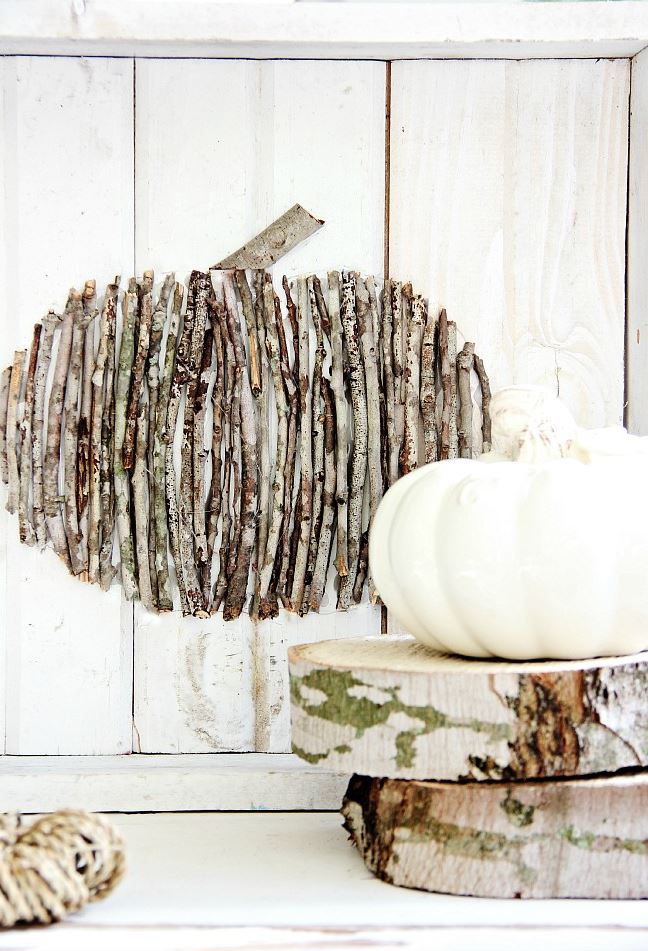 Vous n’avez pas besoin de dépenser une fortune pour célébrer l’automne ! Ramassez de petites branches dans votre jardin et disposez-les de manière à créer une citrouille comme sur cette page.