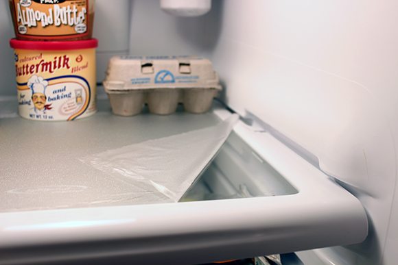 Cette idée est une alternative aux sets de table ! Enlevez vos étagères du frigo, nettoyez-les et attendez qu’elles atteignent la température de la pièce avant de poser une couche de plastique.