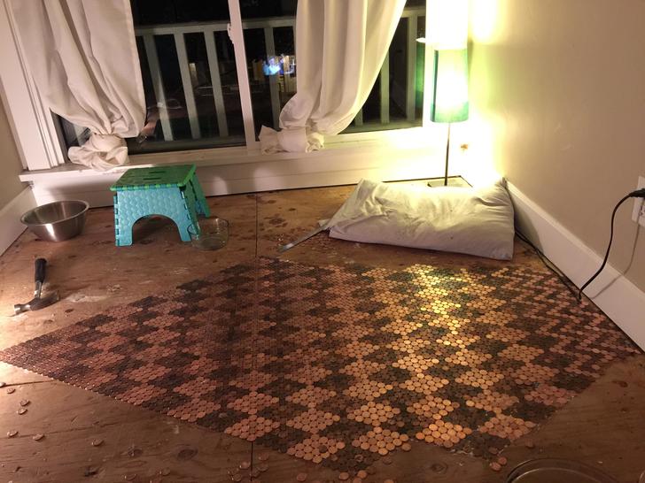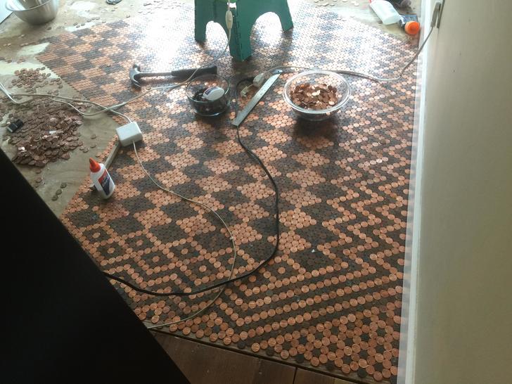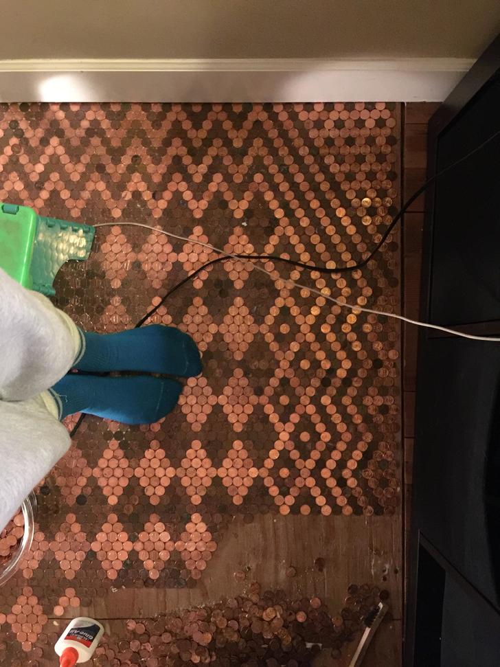 Au début, Tonya cherchait simplement un DIY pour s’occuper et vaincre l’ennui. Elle a alors décidé de recouvrir une partie de son sol avec des pièces. Après un petit tour à la banque, la voilà avec trois sacs de 45 euros en pièces de 1 centime ! Elle s’est également procuré 10 bouteilles de colle Elmer, un mastic à bois, de l’enduit pour joint et de la résine d’époxy pour le revêtement. Cette dernière était d’ailleurs son achat le plus cher, pour environ 130 euros.