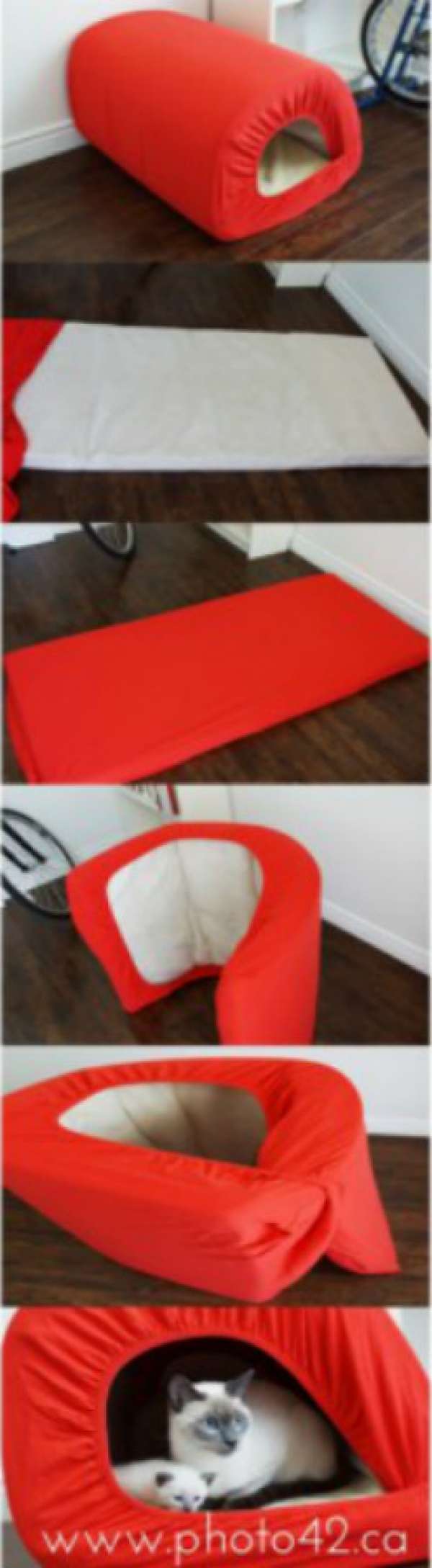 9/ Les chats raffolent des espaces confinés, pourquoi ne pas lui fabriquer une petite grotte avec un matelas et un drap-housse ?