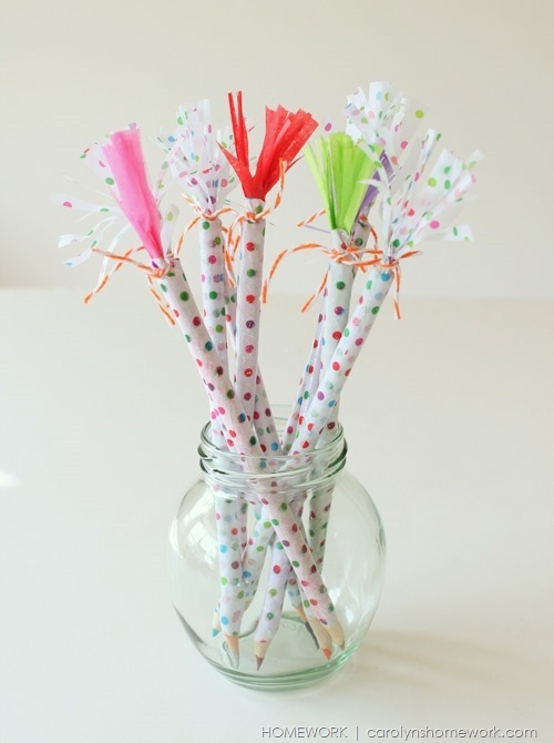 Recouvrez-les entièrement avec du papier de soie décoratif et ajoutez du papier crépon coloré à l’extrémité : c’est très amusant d’utiliser ce genre de crayon, non ?