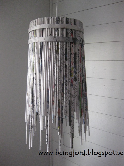 Épatez vos invités avec une décoration suspendue faite maison ! Il vous suffit de coller du papier journal autour de pics à brochettes et de les fixer à un abat-jour.