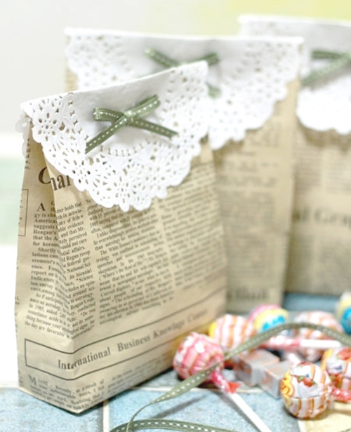 Si vous n’avez plus de papier cadeau sous la main, les journaux font toujours bien l’affaire ! Et n’hésitez pas à ajoutez de la dentelle de papier pour habiller le tout.