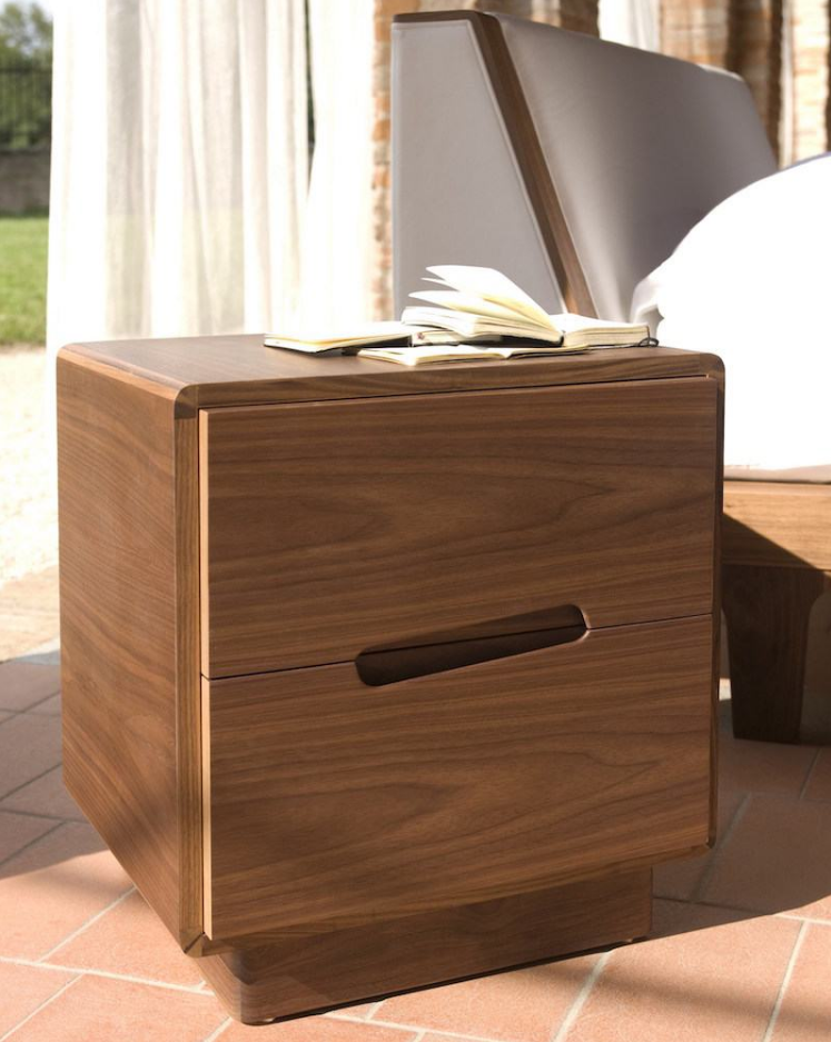 La table de chevet ci-dessous fait partie de la vaste collection Malibu fabriquée en noyer et disposant de deux tiroirs. L’unique poignée encastrée apporte une petite touche de fantaisie à ce meuble contemporain.