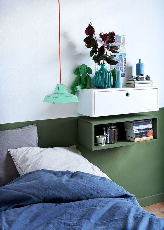 Une bande claire sur la partie haute, une bande plus foncée sur la partie basse et vous obtenez une chambre dynamique, design et chaleureuse.