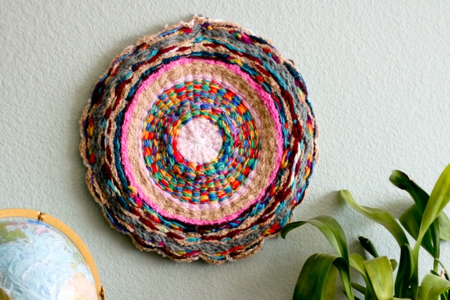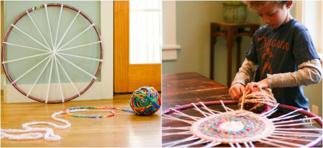 Avec un hula hoop et des fils de couleur épais, votre enfant va pouvoir concevoir un magnifique tapis comme celui sur la photo ci-dessus.