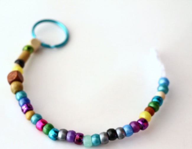 Fixez une extrémité de fil dans un anneau de porte-clés et laissez votre enfant le choix des perles ! N’oubliez pas d’attacher étroitement l’autre extrémité. Dans le tutoriel, un cure-pipe a été utilisé à la place du fil.