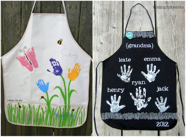 Laissez parler votre imagination sur un simple tablier avec de la peinture acrylique ou pour tissu. Vous pouvez le faire traditionnellement avec des pinceaux, mais vous pouvez aussi vous servir des petites mains ou pieds de vos enfants !