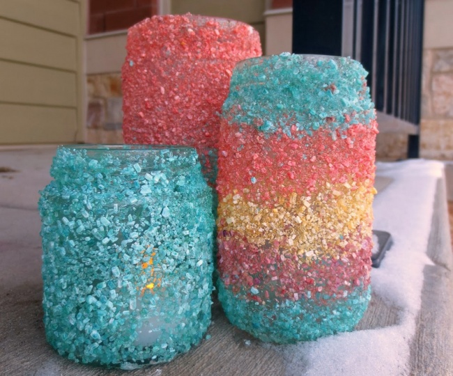 Pour réaliser des porte-bougies aussi brillants, vous allez avoir besoin de gros sel, de colorants alimentaires et d’un peu de colle. Et bien sûr, les instructions présentes sur cette page !