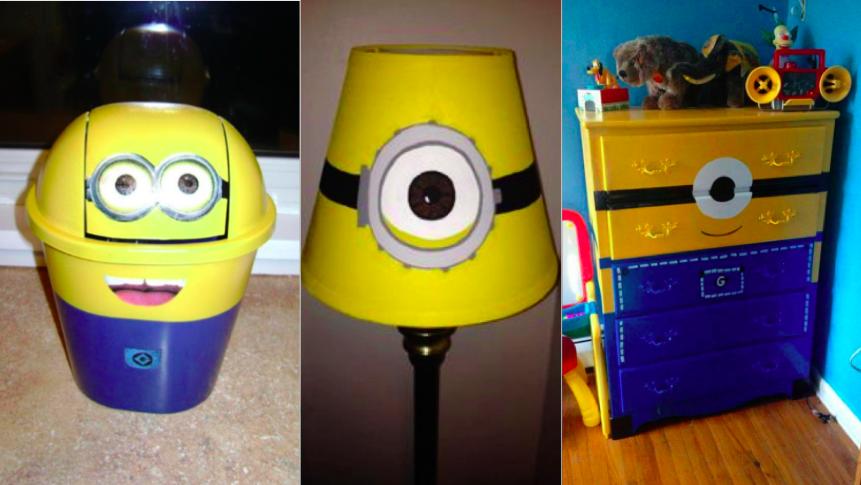1. Avec de la peinture jaune et bleue, et éventuellement quelques accessoires pour donner du relief aux lunettes et aux yeux, le mobilier de vos enfants peut se transformer en Minions de différentes tailles