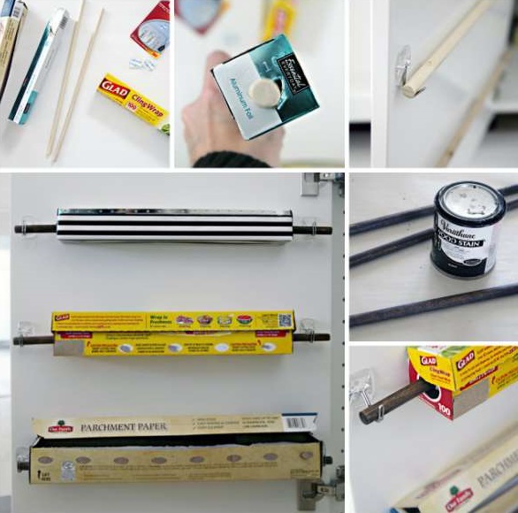 3/ Avec des baguettes et bien sûr des crochets, accrochez vos rouleaux de papier aluminium ou de cellophane pour une facilité d’utilisation