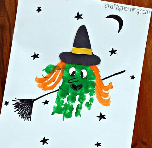 Il ne faut pas grand chose pour réaliser une sorcière sur son balai volant, seulement la main d’un de vos enfants et de la peinture ! Pour plus de détails, c’est ici.