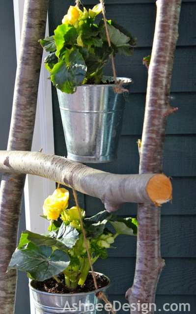 15/ Fabriquez votre propre échelle avec des branches épaisses afin d’y accrocher vos pots de fleurs !