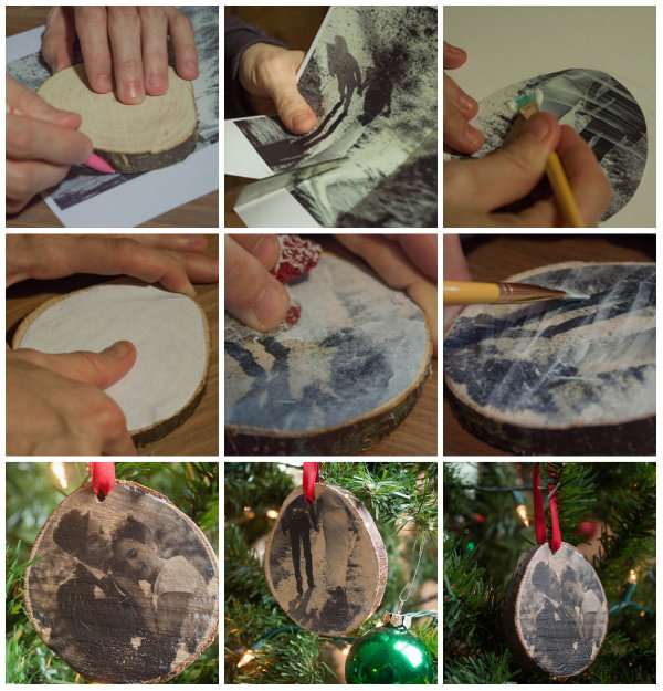 11) Accrochez vos photos sur des rondelles de bois afin d’en faire de magnifiques suspensions pour le sapin