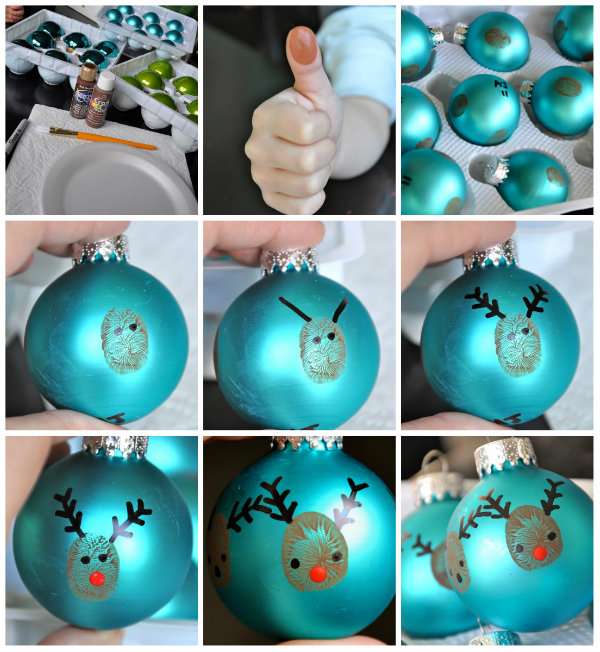 18) Peignez de magnifiques têtes de rennes sur des boules de Noël à l’aide des empreintes de vos enfants