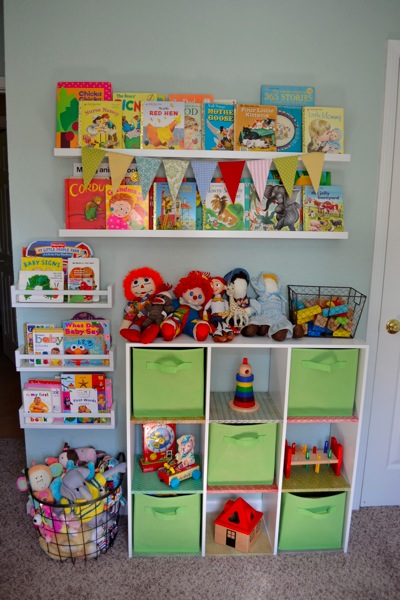 Pour faciliter l’organisation, placez les jouets de vos enfants dans un seul et même endroit. Vous pouvez par exemple utiliser un panier pour les peluches ou encore fixer des étagères à épices pour les livres !