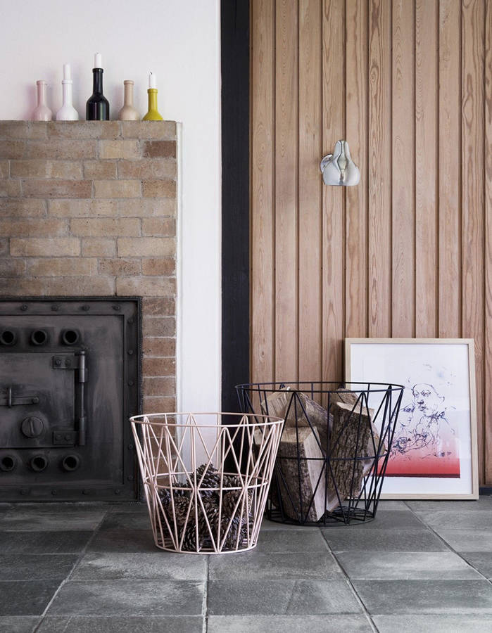 12/ Avec des décorations telles que des paniers métalliques d’un seul côté de la cheminée