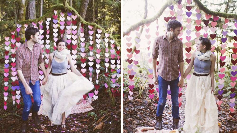 Du romantisme en plein air en décorant une branche de guirlandes en forme de cœurs.