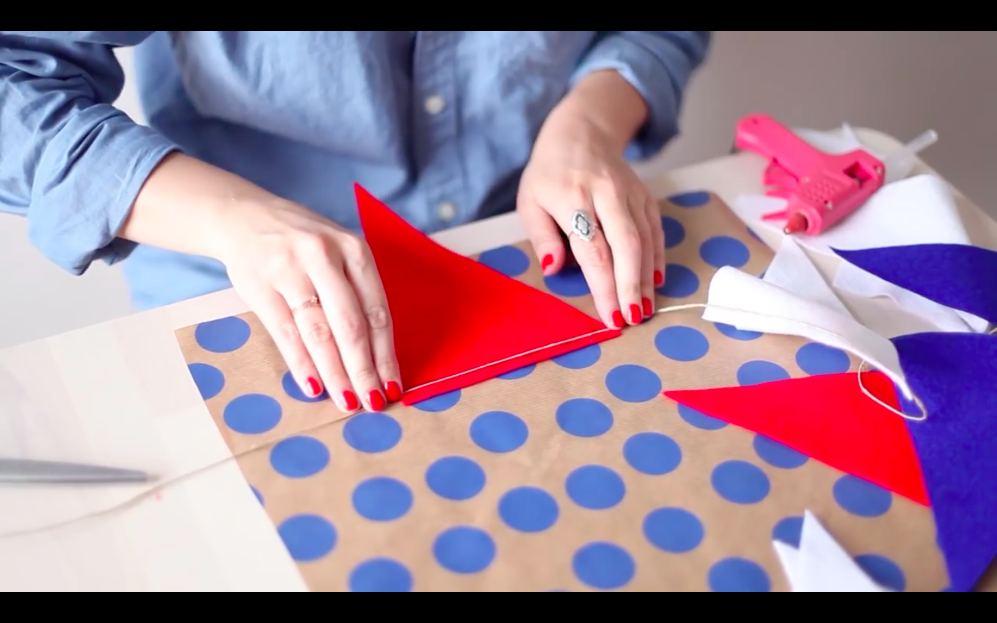 2/ Mettre de la colle à l’aide du pistolet à colle sur le haut de chaque triangle puis placer les fanions sur la ficelle à égale distance les uns des autres.