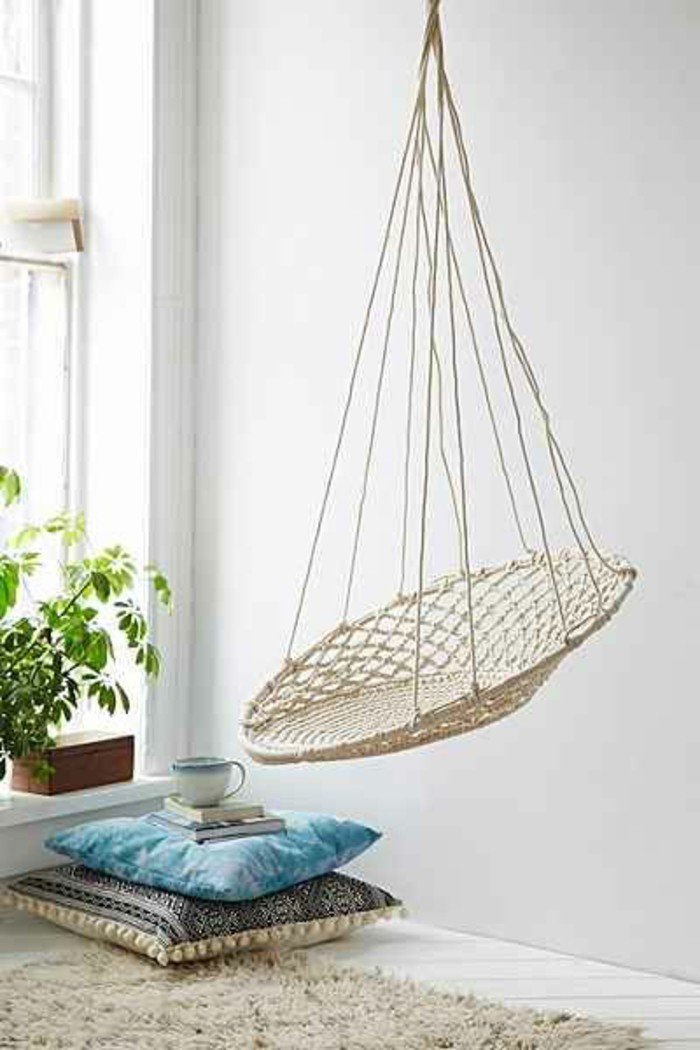 Installez votre fauteuil suspendu près de vos fenêtres afin de bénéficier de la lumière naturelle. Vous pouvez aussi le placer au milieu de votre salon et même optimiser l’espace libre d’un haut plafond pour y poser un hamac en hauteur. Et n’oubliez pas d’harmoniser votre cocon avec votre décoration d’intérieur !