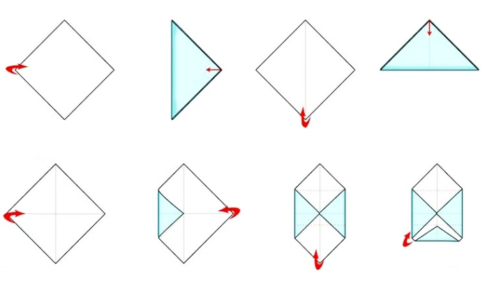 3) Il faut maintenant former de petits triangles. Rabattez les pointes vers le centre, quatre fois. Votre enveloppe est maintenant terminée ! Il ne vous reste plus qu’à scotcher un peu de masking tape au milieu pour faire tenir le tout joliment.