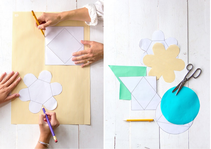 Vous pouvez créer vos propres gabarits en forme d’hexagone ou bien de diamant, mais vous pouvez également en trouver des tout prêts à imprimer, ici et ici. Amusez-vous en les réalisant à l’aide de jolis papiers colorés, d’adhésif et d’une paire de ciseaux.
