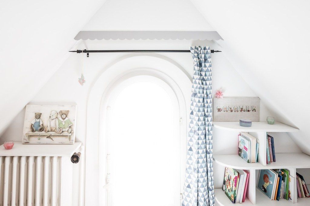 La chambre de la petite fille jouit d’une belle surface au sol, de 16 min 2 s malgré son placement sous les combles. L’espace a su s’organiser en fonction, on observe ainsi une bibliothèque en sous-pente.
