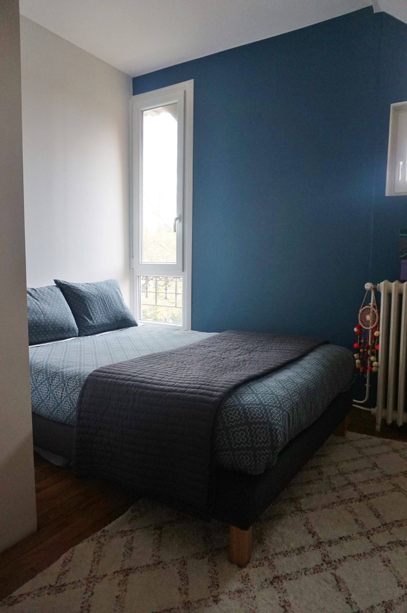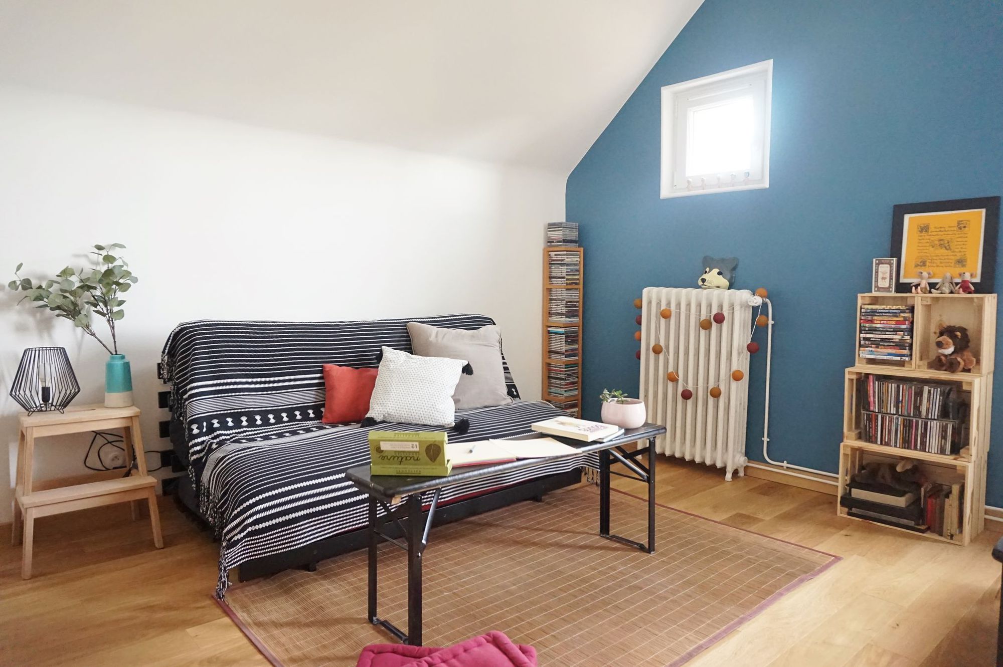 La chambre d’amis est finalement la plus grande de toutes, avec 11,5 m2. Comme dans la chambre parentale, le mur a été peint en bleu. Côté déco, on aime le mariage du bois et du métal. Les propriétaires ont encore participé avec de la récup’ de cagettes en guise de rangement.