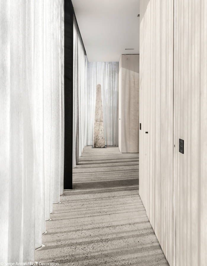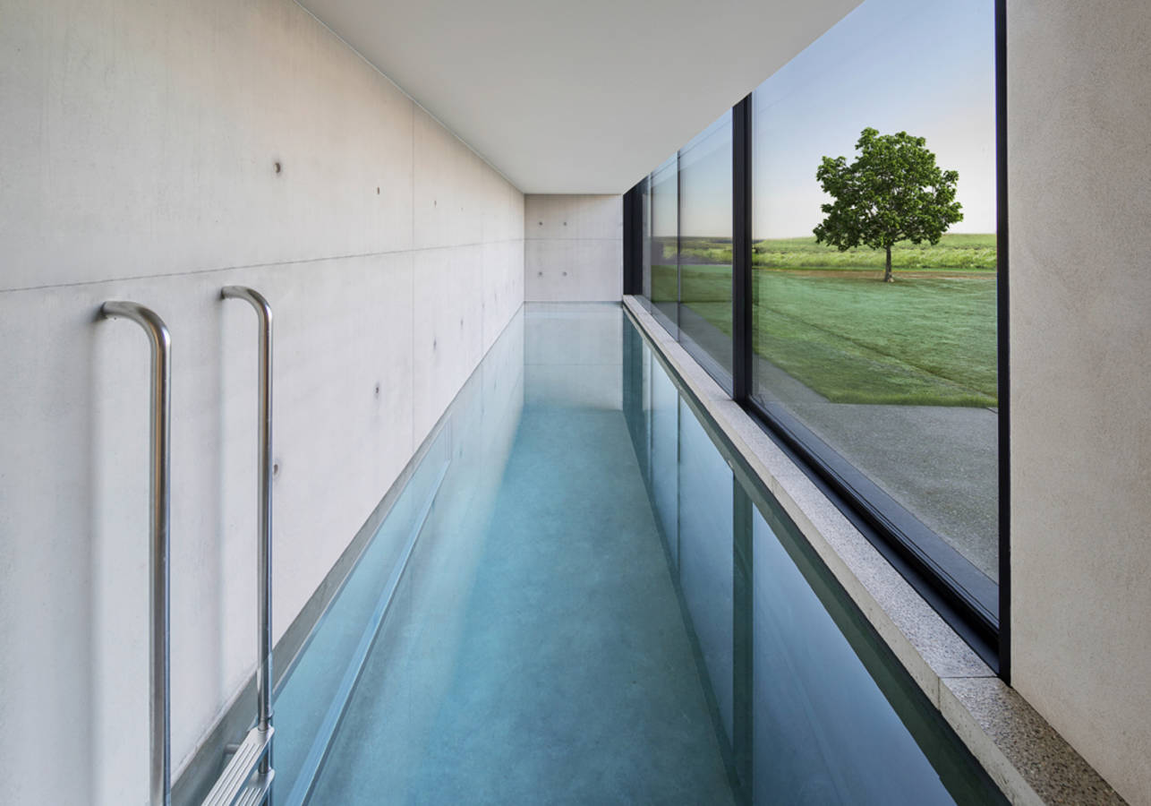 Un couloir de nage avec vue sur le jardin : un luxe. Il a été dessiné par le cabinet d’architectes lui-même, bordé d’une grande baie vitrée.
