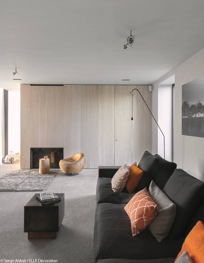 On y trouve un camaïeu chaleureux avec des coussins ethniques. Les touches de design sont également présentes ici à travers le pan de mur en bois et le lampadaire en acier.