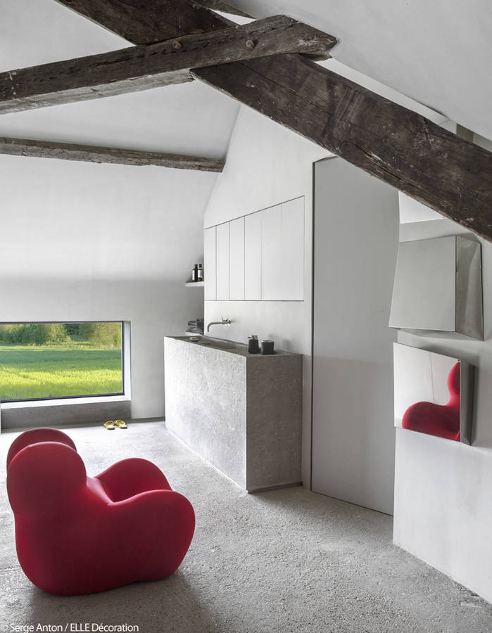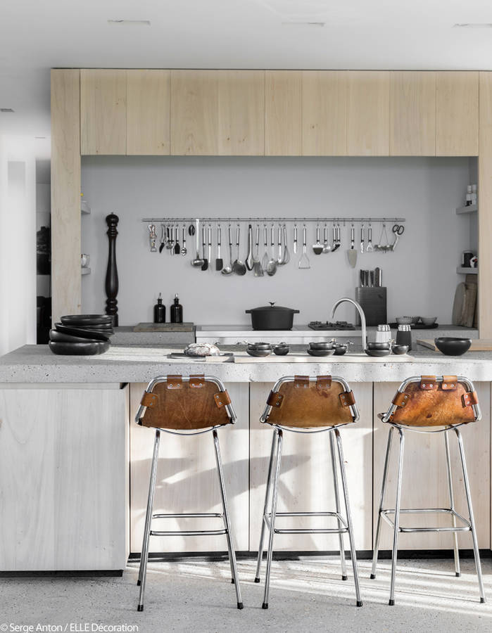 Un mélange harmonieux de belles matières. Le béton se trouve désormais sur le bar et se mêle idéalement au revêtement en bouleau ainsi qu’à l’acier et aux tabourets chinés (une œuvre de Charlotte Perriand pour la station Les Arcs en 1960).