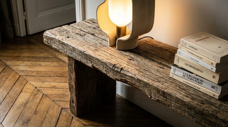 Pourquoi ce choix de matière est-il si impactant pour votre entrée ? Parce que le bois recyclé porte en lui des imperfections, des nuances de marron et une texture brute qui accroche la lumière différemment. En cette période où l’on sort de l’hiver, nous avons besoin de chaleur visuelle. Là où un meuble laqué blanc pourrait rendre l’entrée froide ou clinique, ce bois patiné ancre le décor et réchauffe instantanément l’atmosphère. C’est l’essence même du style intemporel : investir dans des pièces qui semblent avoir toujours été là.