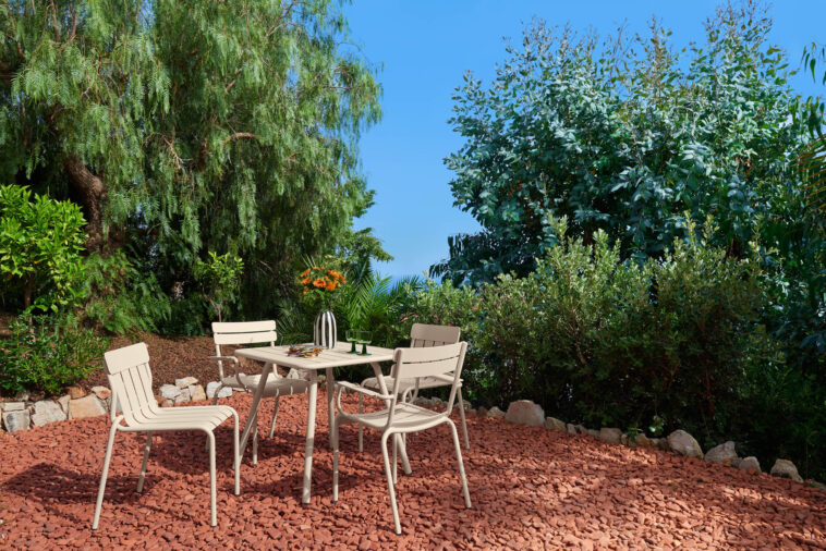 Imaginez une table Fermob en Beige Latte accompagnée de chaises en métal assorti, posée sur un deck en bois clair, avec quelques coussins en lin naturel et une grande jarre en céramique brute. Ou bien un coin détente composé de fauteuils enveloppants, à l’ombre d’un olivier, où le Beige Latte se mêle harmonieusement à la pierre blonde des murets provençaux. Même sur une terrasse urbaine, le rendu est époustouflant en jouant sur les contrastes entre le métal beige et des touches de noir profond ou de vert sauge. L’effet ? Tout sauf fade : c’est chaleureux, contemporain et ultra facile à vivre.