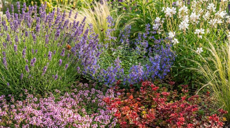 Le pilier central de l’aménagement repose sur trois espèces robustes et spectaculaires. La lavande apporte une base ligneuse et un parfum incomparable. Le nepeta, avec sa généreuse floraison bleue, attire immédiatement les pollinisateurs tout en résistant brillamment aux maladies. Enfin, le gaura offre une floraison continue, semblable à une envolée de petits papillons blancs ou roses. Ce trio garantit une structure pérenne et un volume éclatant à la composition.