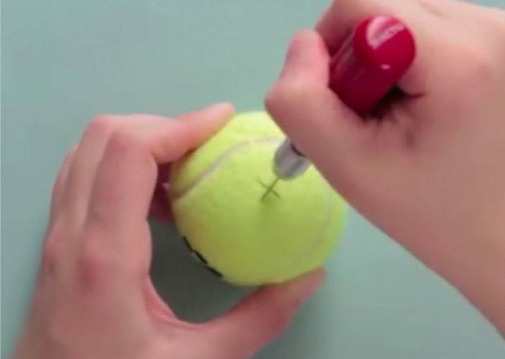 9) Prenez la balle de tennis et découpez une croix de chaque côté à l’aide d’un cutter.