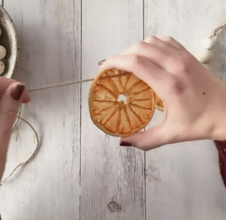 4. Une fois que vos oranges ont refroidi, vous allez pouvoir vous atteler à la confection de la guirlande ! Pour cela, commencez par percer chacune de vos tranches d’orange à l’aide d’un pic à brochette afin de pouvoir faire passer la ficelle au travers.