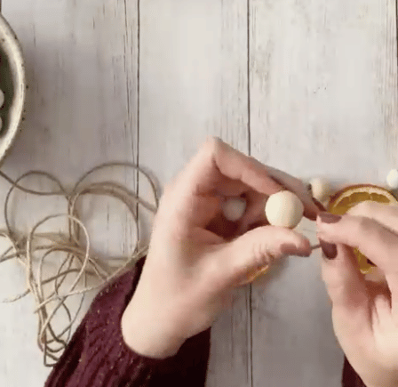 5. Ensuite, commencez à enfiler quelques perles de bois, puis une tranche d’orange, puis de nouveau une ou plusieurs perles et ainsi de suite. Pour des raisons esthétiques, nous vous conseillons de mettre un nombre impair de perles. Vous pouvez agrémenter votre guirlande de bâtons de cannelle ou de branches de sapin pour lui ajouter un peu de verdure !