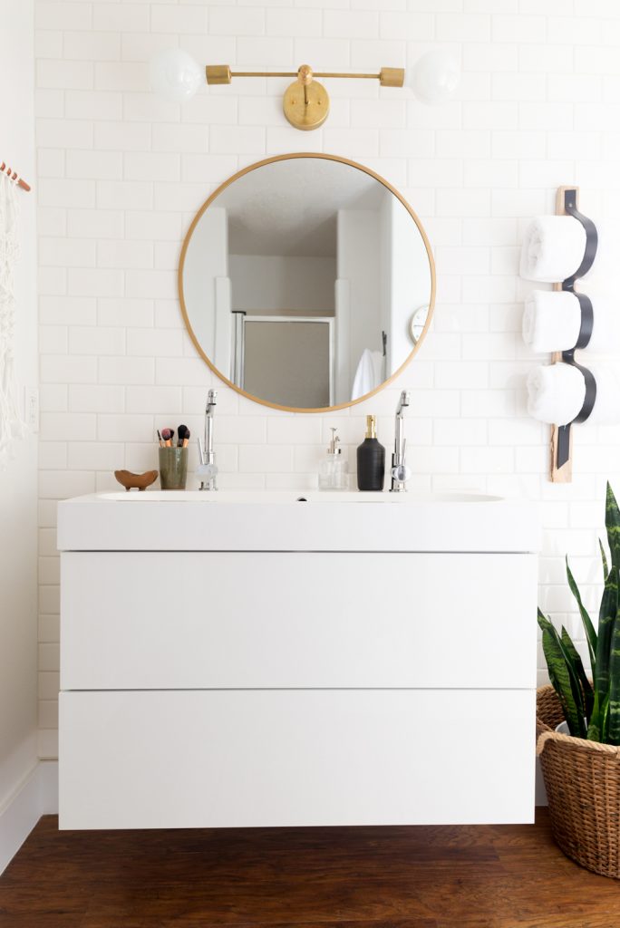 Face au temps imparti, Mandi n’a pas pu commander un nouveau luminaire. Elle a alors fixé une de ses propres lampes de salon au-dessus du miroir !
