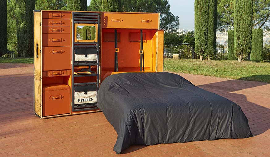 Sa passion pour les malles l’a ainsi mené vers ce concept de malle studio. Les nomades seront ravis de cette création. Un matelas haut de gamme pour deux personnes, un dressing, des lumières et tout un tas de rangements sont présents dans cette grosse boîte. De plus, la qualité est présente. Les matériaux utilisés sont du bois, du fer et du cuir provenant de France et d’Italie.