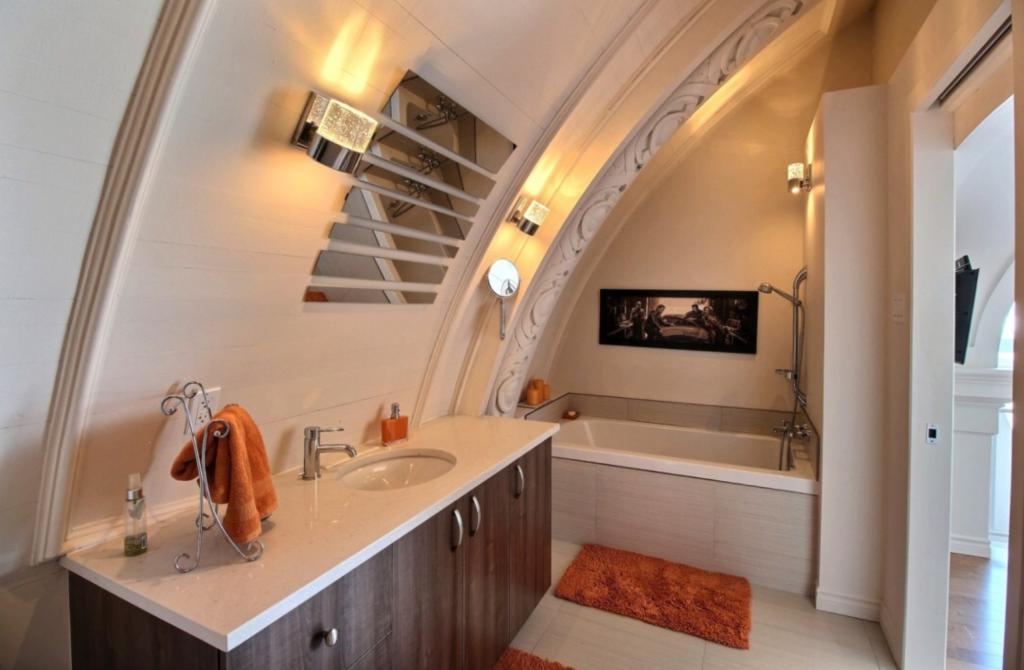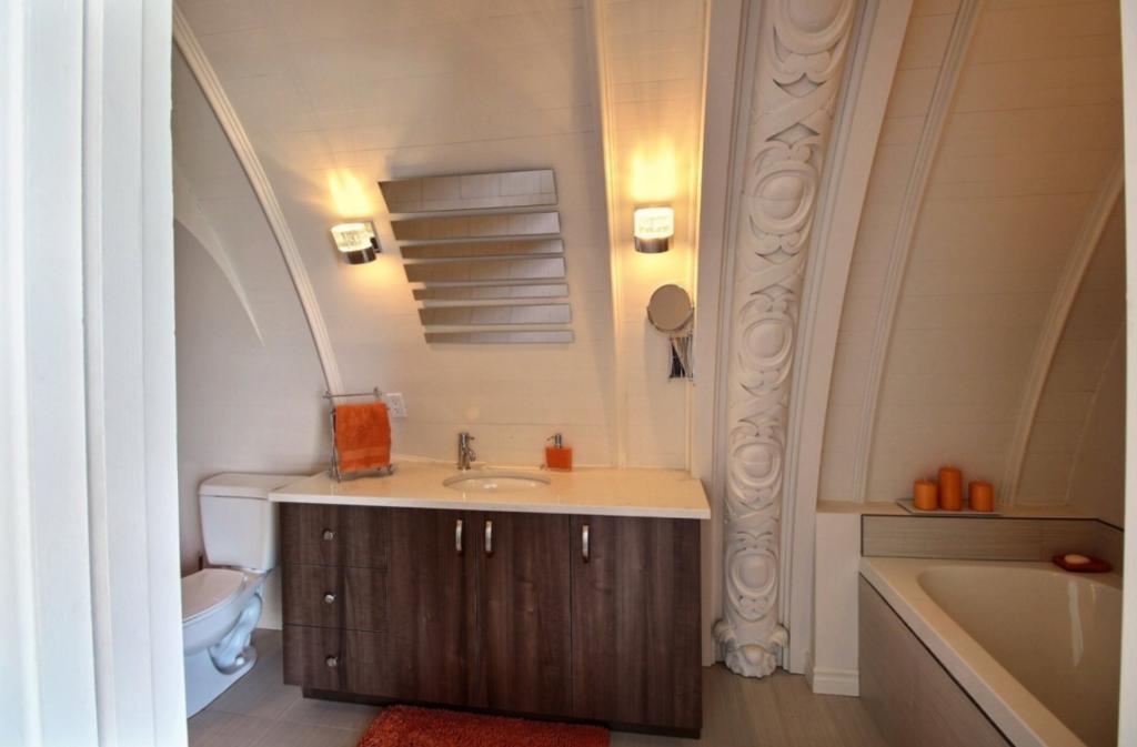 On trouve également deux salles de bains, notamment une jouxtant la chambre principale. Le décor est tout simplement incroyable. Cette pièce profite de l’architecture atypique de l’église et ses belles voûtes.