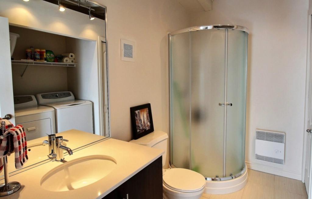 La seconde salle d’eau reste bien équipée avec une petite buanderie et une douche dans l’angle.