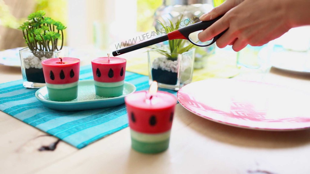 On en voit partout : de notre assiette à nos vêtements, les pastèques sont définitivement à la mode cet été. Fabriquez ces petites bougies et créez une ambiance tropicale pour votre dîner.