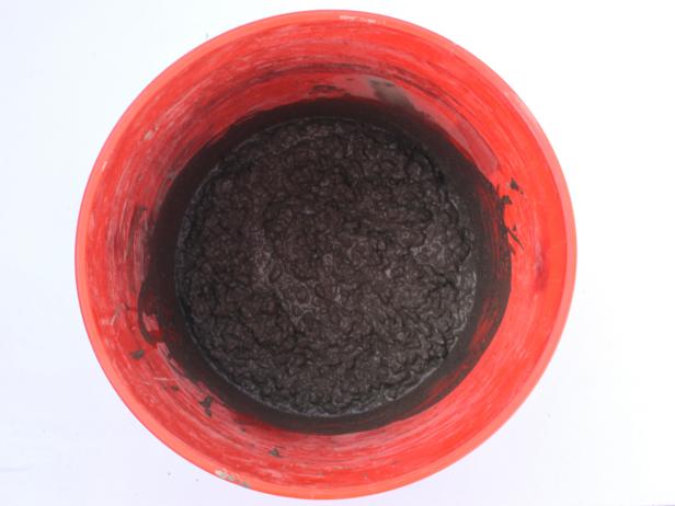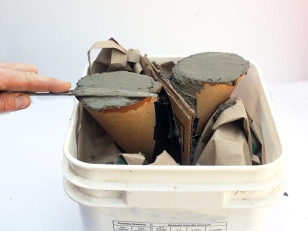 9) Versez lentement et soigneusement le béton dans les cylindres. Il faudra remuer doucement le béton dans les formes pour vous débarrasser des bulles d’air et réaliser une finition lisse.