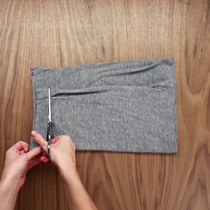 1/Placez votre t-shirt à l’horizontale et coupez-le juste sous les aisselles. Gardez seulement la partie inférieure du t-shirt.