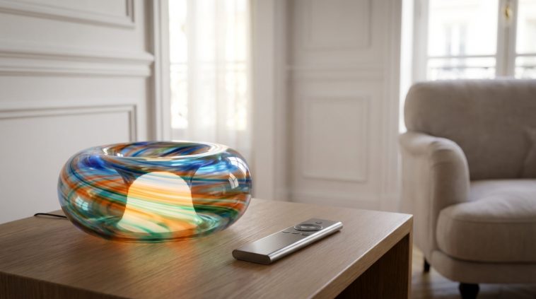 L’argument de choc réside dans la petite télécommande fournie avec la lampe. Une journée de grisaille appelle à des tons mordorés et réconfortants, tandis qu’une douce soirée printanière invite à des reflets plus rafraîchissants. D’une simple pression, la couleur s’harmonise avec l’humeur du moment ou la météo du jour, plongeant instantanément le salon dans une bulle de bien-être absolu.