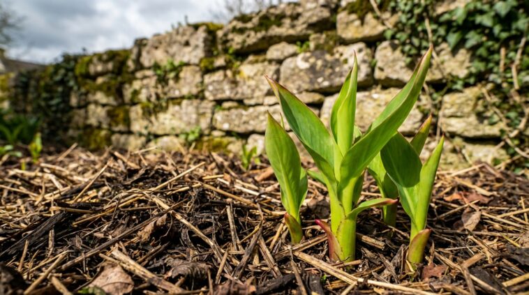 Dès que les vrais froids pointent le bout de leur nez en fin d’automne, un paillage généreux s’impose. Une épaisse litière de feuilles mortes d’environ 30 à 40 centimètres de haut, maintenue autour du pseudo-tronc avec un grillage à poule, constitue un formidable isolant biologique et gratuit. Ce nid de matière organique évite que le gel ne pénètre le cœur du rhizome.