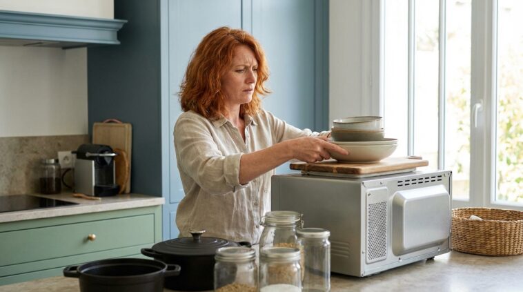 Les objets “pratiques” les plus coupables sont souvent ceux qu’on déplace tous les jours : cafetière, air-fryer, robot, piles d’assiettes, boîtes de conservation, réserve d’épices, bouteilles d’huile. Même des objets légers deviennent problématiques s’ils s’accumulent et si l’on pose aussi un torchon par-dessus “pour faire propre”. La règle simple à retenir : le micro-ondes n’est ni une étagère, ni un plan de travail. Deux habitudes à corriger en priorité : empiler et stocker durablement au-dessus.