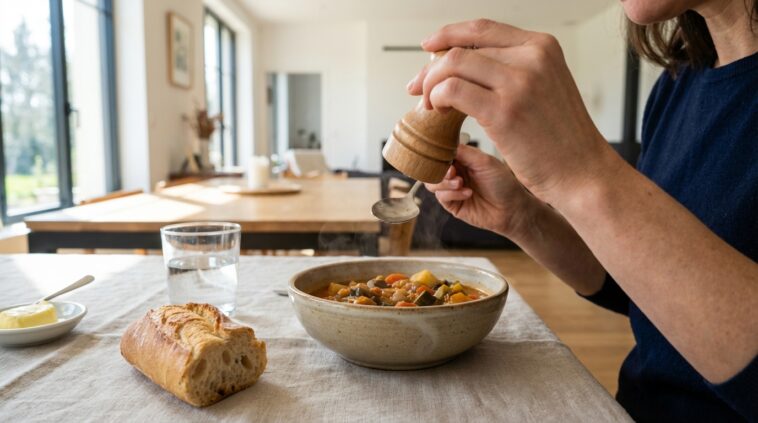 Heureusement, ce conditionnement n’est pas irréversible. Il est possible, et même joyeux, de rééduquer son palais. La première étape consiste à instaurer la règle d’or des trois bouchées. Le principe est simple : interdisez-vous formellement de toucher à la salière avant d’avoir mangé au moins trois bouchées complètes de votre plat. Pourquoi trois ? La première bouchée surprend, la deuxième analyse, la troisième confirme. C’est souvent à la troisième bouchée que le palais s’habitue à la température et commence à percevoir les épices, les jus de cuisson et l’assaisonnement réel du plat. Bien souvent, après ce délai, l’envie de saler disparaît d’elle-même.